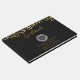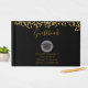 Ein Gästebuch, in dem die Klasse 20xx und der Name und die Schule des Absolventen, in einer goldenen Farbe geschrieben steht. Entwickelt mit einem schwarzen Graduierdeckel, umgeben von einem halbtransparenten weißen Kreis. Die obere Kante ist mit Fake Gold Glitzer Konfetti dekoriert. Schwarzer Hintergrund mit goldener Schrift ist einfach, aber stilvoll.