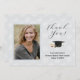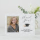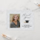 Photo graduation thank you cards. Silver gray color with black text, which makes this design perfect for anyone. Add your portrait photo to the front next to "Thank You" in script. A cap and diploma image separates the remaining text for the grad's name, school, and class. Include a personal message on the back, over a background of graduation caps. Or, delete all wording to hand write each thank you. Also buy this design as an instant download.