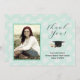 Photo graduation thank you cards. Pale mint green color with black text. Add your portrait photo to the front next to "Thank You" in script. A cap and diploma image separates the remaining text for the grad's name, school, and class. Include a personal message on the back, over a background of graduation caps. Or, delete all wording to hand write each thank you. Also buy this design as an instant download.