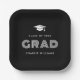Abschluss-Papier-Teller mit einem Graduiertencap und den Namen und das Jahr über und unter dem Text "grad" in einem lustigen, modernen Schriftart.