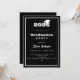 Eine moderne und stilvolle Einladung zu einer Abschlussfeier. Für ihn und sie. Schwarzer Hintergrund, weißer Text und Rahmen. Eine weiße Graduierkappe.