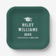 Abschluss Papier Teller mit einem Graduiertencap mit dem Namen, Jahr und Schule unten. Weißer Text auf dunkelgrünem oder benutzerdefiniertem Hintergrund.
