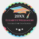 Spaß und moderner Abschluss Umschlag Aufkleber für Ihre Einladungen, speichern Sie die Daten, Ankündigungen und danke Karten. Holografisch aussehende Graduationsmütze und Hintergrund. Modernes Logo-Design mit Ihrem Absolventen-Namen, Schule und Jahr des Abschlusses.