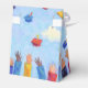 Für eine Graduierungsparty sind diese Gefälligkeitsboxen mit einer Szene dekoriert, in der farbenfrohe Graduierungskappen in die Luft geworfen werden, die gegen einen blauen Himmel mit puffigen Wolken gezeigt werden. Im Text steht "Danke".