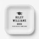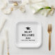 Abschluss Papier Teller mit einem Graduiertencap mit dem Namen, Jahr und Schule unten. Schwarzer Text auf einem weißen oder benutzerdefinierten Hintergrund.