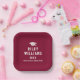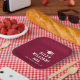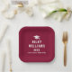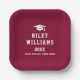 Abschluss Papier Teller mit einem Graduiertencap mit dem Namen, Jahr und Schule unten. Weißer Text auf bordeauxfarbenem oder benutzerdefiniertem Hintergrund.