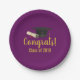 Glückwünsche Papier Teller mit einem schicken Design illustriert mit Graduierungshülse und Diplom. Text sagt: Klasse von 2018 (Sie können das Jahr anpassen). Set auf einem hübschen lila Hintergrund mit goldfarbenen Buchstaben. Einfach, modern und elegant.
