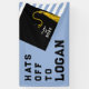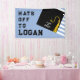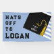 Creative Graduiertenparty Banner mit schwarzer und goldener Kappe auf hellblauem Hintergrund. So personalisieren Sie die Bearbeitung von Text, Name und Senior-Klasse Jahr.