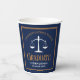 Diese schicke marineblaue und goldene Custom Law School Abitur Party Papier Becher zeigt klassische Typografie für eine Klasse von 2025 Absolvent. Passen Sie mit Ihrem geschlossen Jahr unter den weißen Maßstäben der Justiz für dieses große personalisierte Anwalt oder Anwalt Geschenk der Glückwünsche.