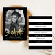 Trendy Graduation Party Einladungen mit dem Foto des Absolventen in einem schwarz strukturierten Maskenrahmen mit "Graduate" in einem handgeschriebenen Goldfolienskript. Personalisieren Sie die Front der Foto Graduation Party lädt durch Hinzufügen des Graduiertennamens, der Schule und Abschluss Jahr. Die Einladung kehrt um, um Ihre Party-Details mit einem schwarz-weiß gestreiften Design anzuzeigen.