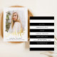 Trendy Graduation Party Einladungen mit dem Foto des Absolventen in einem texturierten Maskenrahmen mit "Graduate" in einem handgeschriebenen Goldfolienskript. Personalisieren Sie die Front der Foto Graduation Party einladen, indem Sie den Namen, den Schulnamen und Abschluss Jahr des Absolventen. Die Einladung kehrt zurück, um Ihre Graduiertenpartien Details mit einem schwarz-weiß gestreiften Design anzuzeigen.
