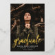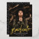 Einfache Graduiertenparty Einladung mit dem Foto des Absolventen mit "Graduate" in realer Goldfolie-Schrift. Personalisieren Sie die Front der Foto Graduation Party einladen, indem Sie den Namen, den Schulnamen und Abschluss Jahr des Absolventen. Die Einladung kehrt um, um Ihre Party-Details mit einem Muster von weißen Sprinklen mit einem schwarzen Hintergrund oder Farbe Ihrer Wahl.