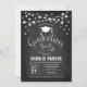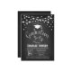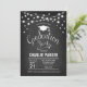 Einladung zur Graduiertenparty für Frauen oder Männer. Elegante Einlagekarte in Schwarz und Weiß mit Chalkboard-Muster. Enthält String Fee Lichter, eine Kappe und Typografie Script Schriftart. Ideal für einen stilvollen Abschluss.