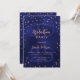 Eine glamouröse Einladungskarte für eine Graduiertenparty für ihn und sie. Ein marineblau mit goldenen Sternen dekorierter Hintergrund mit Imitaten. Die blaue Farbe ist ungleichmäßig. Personalisieren und fügen Sie ein Jahr, Name, Jahr und Party Details. Der Abschluss und der Name sind mit einem modernen, handgeschriebenen Stil geschrieben. Golden farbiger Text. Zurück: marineblau Hintergrund und goldene Sterne.