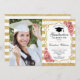 Einladung zur Graduation Party mit Ihrem Foto. Enthält Streifen, Skript-Schriftart, pastellfarbene Rosen, Tassel und Konfetti. Elegantes Design mit Imitaten Glitzer Gold. Ideal für eine elegante Feier.