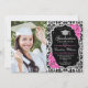 Einladung zur Graduation Party mit Ihrem Foto. Enthält Schwarz-weißes Damast-Muster, Skript-Schriftart, pastellfarbene Rosen, Tassel und Konfetti. Elegantes Schwarz-weißes rosa Design mit Imitaten Glitzer Silber. Ideal für eine elegante Feier.