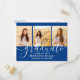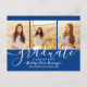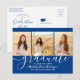 Verkünden Sie eine High School oder Uni-Abschluß und laden Sie Familie und Freunde zu Feiern mit maßgeschneiderten 3 Foto Collage Party Einladung Postkarten. Alle Bilder und Formulierungen sind einfach zu personalisieren und die Farben können mit dem Zazzle Design Tool leicht verändert werden. Diese Vorlage ist als kombinierte Anzeigenkarte und Party Einladung, die mit allen Details Ihrer Wahl, wie Eltern Namen, besondere Ehren, Abschluss Titel, Lieblings-inspirierendes Zitat, Graduiertenplan oder neue Adresse, angepasst werden können. Das königsblaue und weiße Design besticht durch eine Mörtel-Kappe, moderne, trendige Schriftzeichen-Kalligraphie, elegante minimalistische Typografie und drei beliebte Fotos, wie Seniorenbilder oder Bilder aus der Anlaufzeremonie. Diese Abschluss-Karte ist eine stilvolle Möglichkeit, ein besonderes Fest anzukündigen. Herzlichen Glückwunsch an den Absolventen!