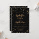 Eine glamouröse Einladungskarte für eine Graduiertenparty für ihn und sie. Ein schwarzer Hintergrund mit goldenen Imitaten. Personalisieren und fügen Sie einen Namen und Party-Details hinzu. Der Abschluss und der Name sind mit einem modernen, handgeschriebenen Stil geschrieben. Golden farbiger Text. Zurück: schwarzer Hintergrund und goldene Sterne.