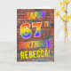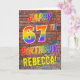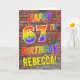 An der Vorderseite dieses auffälligen, lustigen und aufregenden Geburtstagskarten-Designs steht die Nachricht "HAPPY 67TH BIRTHDAY" mit Buchstaben mit einem farbigen Regenbogenmuster und einem individuell einstellbaren, gelben Namen auf einem Wand-of-Ziegelmuster-Hintergrund. Das Aussehen wird durch das Graffiti oder Straßenkunst inspiriert, das an einer Wand gezeichnet wird. Im Inneren befindet sich eine individuell anpassbare Geburtstagsgrüßbotschaft. Eine glückliche, lustige, anpassbare Geburtstagskarte wie diese könnte eine besondere Art sein, jemandes siebzigsten Geburtstag zu gedenken. [~Z0000357]