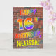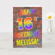 An der Vorderseite dieses auffälligen, lebendigen und lustigen Geburtstagskarten-Designs steht die Meldung "HAPPY 16TH BIRTHDAY" mit Buchstaben mit einem farbigen Regenbogenmuster und einem individuell einstellbaren, gelben Namen auf einem Ziegelmauerhintergrund. Das Aussehen wird durch das Graffiti oder Straßenkunst inspiriert, das an einer Wand gezeichnet wird. Im Inneren befindet sich eine individuell anpassbare Geburtstagsgrüßbotschaft. Eine glückliche, lustige, individuell anpassbare Geburtstagskarte wie diese könnte jemandem geschenkt werden, der seinen 16. Geburtstag feiert. [~Z0000357]