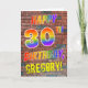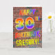 An der Vorderseite dieses spannenden, auffälligen und lustigen Geburtstagskarten-Designs steht die Meldung "HAPPY 30TH BIRTHDAY" mit Buchstaben mit einem farbigen Regenbogenmuster und einem gelben individuelle Name auf einem Wand-of-Stein-Muster-Hintergrund. Der Stil wird durch Graffiti oder Straßenkunst inspiriert, die an einer Wand gezeichnet werden. Im Inneren befindet sich eine Geburtstags-Grußbotschaft, die individuell angepasst werden kann. Eine fröhliche, lustige, individuell gestaltete Geburtstagskarte wie diese könnte zum Feiern des 30. Geburtstages von jemandem gegeben werden. [~Z0000357]