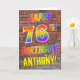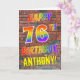 An der Vorderseite dieses lustigen, auffälligen und lebendigen Geburtstagskarten-Designs steht die Meldung "HAPPY 76TH BIRTHDAY" mit Buchstaben mit einem farbigen Regenbogenmuster und einem personalisiert namenfarbenen Gelb auf einem Ziegelmauerhintergrund. Der Stil wird durch Graffiti oder Straßenkunst inspiriert, die an einer Wand gezeichnet werden. Im Inneren befindet sich eine individuell anpassbare Geburtstagsgrüßbotschaft. Eine lustige, glückliche, maßgeschneiderte Geburtstagskarte wie diese könnte eine besondere Art sein, jemanden zum Geburtstag zu begrüßen, der seinen 76. Geburtstag feiert. [~Z0000357]