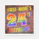 An der Vorderseite dieses lustigen, auffälligen und aufregenden Geburtstags-Motivs steht ein individuelle Name und die Botschaft "24. BIRTHDAY!" mit Buchstaben mit einem farbigen Regenbogenspektrum, inspiriert Farbverlauf, auf einem Wand-of-Stein inspiriert Muster-Hintergrund. Das Erscheinungsbild wird durch die an einer Wand gezeichnet Straßenkunst oder Graffiti inspiriert. So schöne Papierservietten können bei einer Geburtstagsparty zu Ehren von jemandem zum vierundzwanzigsten Geburtstag verwendet werden. [~Z0000367]