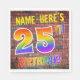 An der Vorderseite dieses lebendigen, aufregenden und auffälligen Geburtstags-Motivs steht ein individualisierbarer Name, und die Botschaft "25. BIRTHTAY!" mit Buchstaben mit einem farbigen Regenbogenspektrum, inspiriert Farbverlaufsmuster, auf einem Ziegelwand inspiriert Muster-Hintergrund. Das Aussehen wird durch das Graffiti oder Straßenkunst inspiriert, das an einer Wand gezeichnet wird. So eine lustige Papierserviette könnte bei einer Geburtstagsparty zum Gedenken an den fünfundzwanzigsten Geburtstag eines Menschen verwendet werden. [~Z0000367]