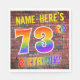 Die Vorderseite dieses lebendigen, aufregenden und auffälligen Geburtstags-Design aus Papierservietten hat einen personalisierten Namen und die Botschaft "73RD BIRTHDAY!" mit Buchstaben mit einem farbigen Regenbogenspektrum inspiriert Farbverlaufsmuster, auf einem Wand-of-Stein inspiriert Musterhintergrund. Das Aussehen wird durch das von Straßenkunst oder Graffiti inspiriert, das an einer Wand gezeichnet wird. So schöne Papierservietten können bei einer Geburtstagsparty zu Ehren von jemandem 73. Geburtstag verwendet werden. [~Z0000367]