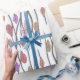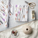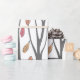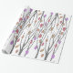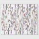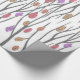 Erntedank oder Fall saisonale Alltagsbaum und Blätter grafische gemusterte Verpackung ideal für Erntedank, Erntezeit, Winter oder Herbst Geschenke. Papier in graubrauner Farbe mit hellrosa, lila, orangefarbenen und rosa Blätter auf weißem Hintergrund. Design von Sarah Trett.