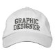 "GRAFISCHER DESIGNER" bestickter Text auf den Hut.