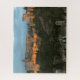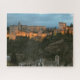 Die berühmte Alhambra in Granada, Spanien, beleuchtet nachts mit Dächern und Schornsteinen der Altstadt.
