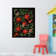Granatäpfel mit üppigen Blätter und reichhaltigen roten Früchten erstrecken sich über einen schwarzen Hintergrund. Eine sekundäre Ebene verblasst subtil, wodurch Tiefe hinzugefügt wird. Traditionell auf Papier mit Markern gemalt, werden die Elemente gescannt und in Fotoshop zu einem Muster zusammengesetzt.
