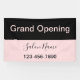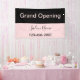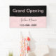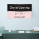 Ein Banner lasse jedem zu wissen, dass Ihr neuer Schönheitssalon für Geschäftsreisende geöffnet ist. Der hellrosa Text oben steht für "Grand Opening". Der rosa Text ist auf einem schwarzen Streifen. Ein rosa Streifen unten hat ein elegantes schwarzes Drehbuch für den Namen des Schönheitssalons. Für die Telefonnummer des Salons stehen auch schwarze Anzeigennummern zur Verfügung.