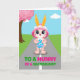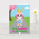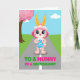 This card features a cute, human-like bunny centered on a gray path that narrows into the distance, set in a spring scene 🌷. The bunny has big blue eyes and a tiny red nose, and its pink-and-white striped body is drawn with soft shading that makes it look gently cuddly. A pink bonnet with white frills sits on its head, while long golden-yellow ears rise up and lean slightly, as if posing for someone it adores 🐰. Held close in its arms is a bright blue egg decorated with pink-and-white swirling garlands, like a gift meant for a dear friend or someone special. To the left stands a brown tree with a rounded canopy of pink blossoms, while green fields spread out on both sides of the path. Along the bottom, the message “TO A HUNNY OF A GRANDBUNNY” is placed in uppercase letters, with “TO A” and “OF A” in emerald green and the rest in fuchsia for contrast. Above it all, a pale blue sky stretches behind the scene with a single puffy white cloud near the top.