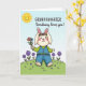 This card shows a sweet rabbit-like character standing front and center on a grassy hill, offering a small bouquet as if sharing a gentle crush or close friendship 🐰. The character has soft cream fur, pink inner ears, and rosy cheeks, with a tiny flower crown resting between its ears. It wears blue overalls layered over a bright green top, and its paws curl carefully around a multicolored bunch of blossoms. Around the hill, purple tulip-shaped flowers rise up, each with a simple smiling face that echoes the bunny’s friendly expression 🌷. Above the scene, the sky fades from pale to light blue, and a round sun with a smiling face sits high overhead. The text sits near the top of the card, with “GRANDDAUGHTER” in large uppercase letters and “Somebuny loves you!” placed just below it in a lighter, hand-lettered style. Soft outlines define the meadow, the bunny’s overalls, and the tulip petals, with small blades of grass drawn one by one across the knoll.