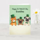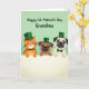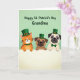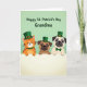 This card features three animal friends peeking over a bright white panel at the bottom, their paws resting on the edge as if they’ve scooted close together for a photo 💚. On the left, an orange tabby cat with a green collar wears a little leprechaun hat, grinning with wide eyes that seem to invite a laugh. Beside the cat, two pugs in small green top hats look straight ahead with soft, eager expressions, like they’re in on a sweet surprise. The pug on the right also wears a neat green bow tie, adding a slightly dressy touch that pairs nicely with the cat’s hat ☘️. Across the top, the message “Happy St. Patrick’s Day Grandma” sits in dark green lettering, centered and easy to read against the pale background. Behind them, the backdrop fades from mint green to an even lighter green, making the warm orange fur and rich greens stand out. The overall scene is gently shaded, with the characters’ faces and hats defined against the smooth gradient and the crisp white panel.