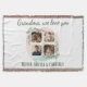 Celebrate Grandma with this beautiful personalized throw blanket featuring a custom photo collage, a delicate eucalyptus design and soft watercolor accents, framing four family photos. The loving message 'Grandma, we love you' makes it an unforgettable gift for birthdays, holidays, or just because. Customize with your favorite photos and names for a truly unique present.