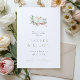 A beautiful grandmillenial style couples shower invitation featuring a watercolor illustration of two birds sitting in a branch with a pink bow and a simple modern serif font in sage green and grey.