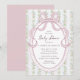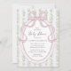 Celebrate the mom-to-be with this charming grandmillennial inspired baby shower invitation featuring an elegant pink bow frame and delicate vintage floral striped background. Soft pastel colors and romantic botanical details create a timeless cottagecore aesthetic perfect for a feminine baby shower celebration.