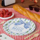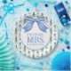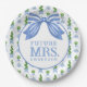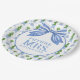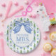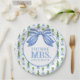 Dieses Topiary Plattendesign zeichnet sich durch einen sehr chic blauen und grünen Gitter gemusterten Hintergrund mit einem koordinierenden blau-weiß gestreiften Bogen aus. Sie können mit Ihrem Nachnamen personalisieren.