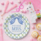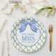 Dieses Topiary Plattendesign zeichnet sich durch einen sehr chic blauen und grünen Gitter gemusterten Hintergrund mit einem koordinierenden blau-weiß gestreiften Bogen aus. Sie können mit Ihrem Nachnamen personalisieren.