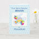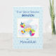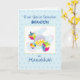 Schicken Sie diese wunderbare Karte an Ihren Enkel auf Hanukkah. Der hellblaue Hintergrund hat dunklere blaue Punkte. Im Mittelpunkt dieser jüdischen Urlaubskarte steht ein Dreifach mit Spielzeug und Geschenken. Personalisieren Sie die Karte mit seinem Namen auf der Vorderseite.