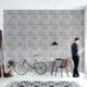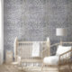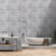 Ein abstraktes, grafisches Muster, das durchgemacht wurde, ein digitalisierter Bearbeitungsprozess, der das Aussehen von Granit, Marmor nachahmt, in einer einzigartigen Mischung aus Grau, Gelb, Aqua, Braun und Schwarz.