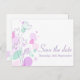 Eine schöne und einfache rosa lila und minzgrüne Blume Kontur und grafische Blätter Save the Date Hochzeitspostkarte. Teil des grafischen modernen Blume Blütenblütenhochzeit-Set. Ein elegantes, exklusives Design von Sarah Trett.