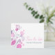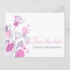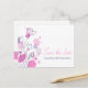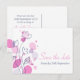Eine schöne und einfache rosa lila Pflaume und marineblaue Blume Kontur und grafische Blätter Save the Date Hochzeitspostkarte. Teil des grafischen modernen Blume Blütenblütenhochzeit-Set. Ein elegantes, exklusives Design von Sarah Trett.