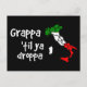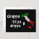 Der Grappa wird durch Destillieren der Felle, des Zellstoffs, der Samen und der Stiele hergestellt, die nach dem Pressen der Trauben im Weinanbau verbleiben. In Italien wird Grappa oft in kleinen Gläsern als "Verdauungsgetränk" oder als Getränk nach dem Abendessen serviert. Grappa 'til ya droppa. Dieses kursiv gestaltete Kartendesign eignet sich für schwarze und dunkle Hintergründe.