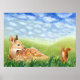 Eine kleine Garnele und ein Eichhörnchen. Eine kleine Rasenfläche lag im großen, grünen Gras. Er war ein Rotwild. Er beobachtete die Wolken sanft über den weiten Himmel schweben ... Bilderbuch Illustration aus einem Kinderbuch "Die Roten Hirsche und die Haselnüsse" - geschrieben und illustriert von Julia Doria.