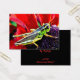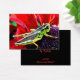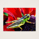 Diese farbenfrohe Artist Trading Card bietet einen glänzenden, grünen, gelben und schwarzen Grasshopper, der in der lila Mitte einer Blume mit prächtigen roten Blütenblättern steht.