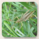 Dieser phantastische Kork-Untersetzer zeigt ein detailliertes Makrofoto eines kleinen grünen Grasshoppers mit braunen, mottelierten Markierungen auf dem Gras. Auf dem Foto sehen Sie die Details der geflochtenen Beine, lange Antennen und schwarz-goldene Augen des Grashüpfers.